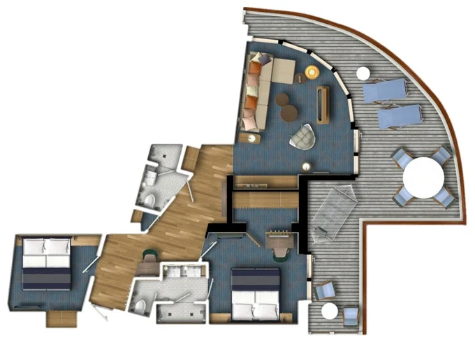 | SPNO - Panorama Suite 73-77 m² + balkón 31-36 m² so stolom, ležadlami a hojdacou sieťou. 2 spálne a 2 kúpeľne. 6,9,10. paluba. Max 6 osoby. Výhody Suite. | 18 758 € 18 758 € za osobu |